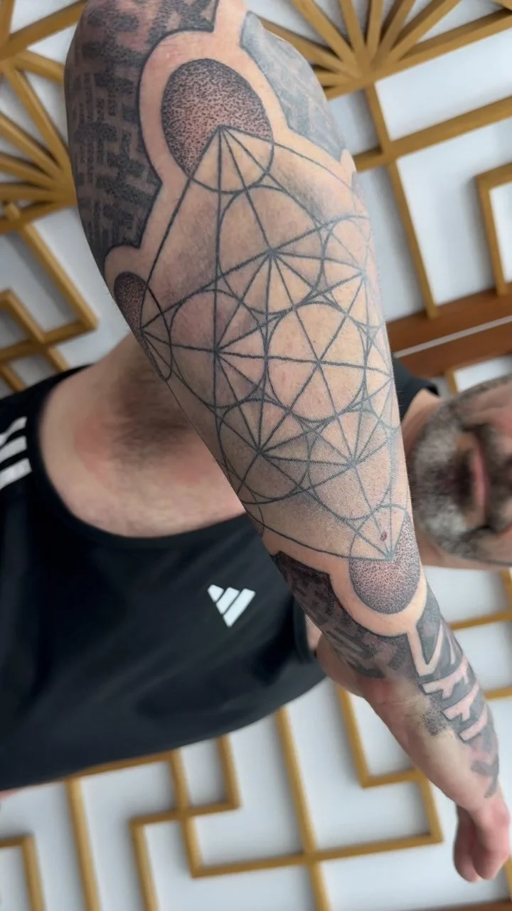 Professional tattooist outlining a basic process of how to get a tattoo and a time lapse of a full geometric sleeve.